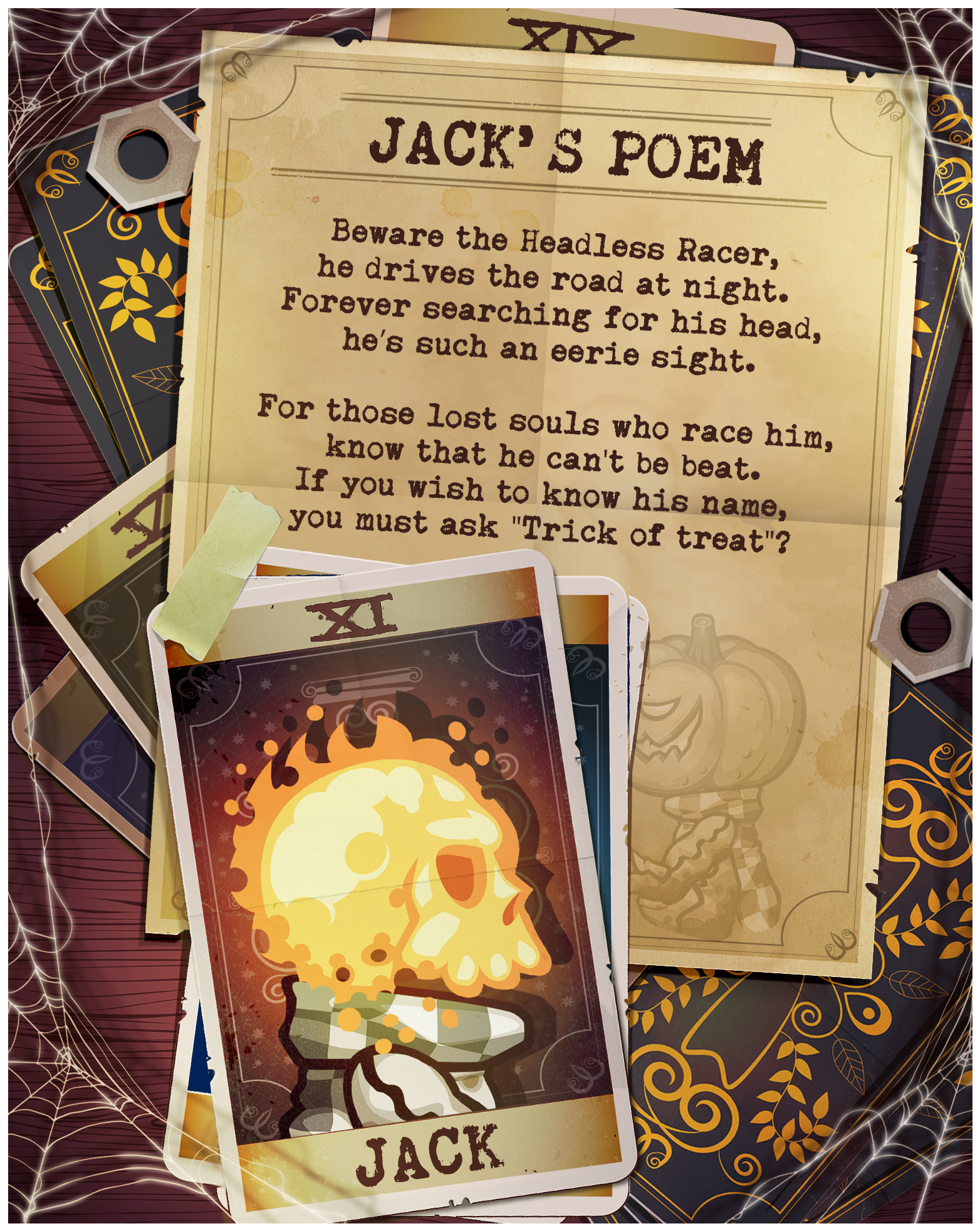 Jack's Poem. Beware the Headless Racer, he drives the road at night. Forever searching for his head, he's such an eerie sight. For those lost souls who race him, know that he can't be beat. If you wish to know his name you must ask "Trick of Treat"?
